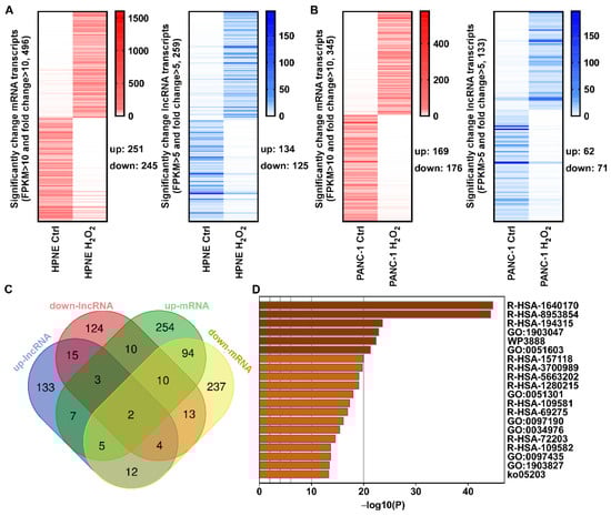Compared with control cells, H2O2 treatment induced an upregulation of 13,680 mRNA transcripts and a downregulation of 13,012 mRNAs in HPNE cells, using fold change > 2 and p < 0.05 as the cutoff level (Figure 1B). In PANC-1 cells; H2O2 caused an upregulation of 10,832 mRNA transcripts and a downregulation of 11,321 mRNAs (Figure 1B, left). The numbers of differentially expressed lncRNA transcripts in response to H2O2 treatment were about half of that of mRNA transcripts (Figure 1B, right). Further analysis showed that, among the differentially expressed RNA transcripts, there were 2762 mRNA and 1164 lncRNA transcripts commonly upregulated in both cell lines, and 2758 mRNA and 1145 lncRNA transcripts commonly downregulated in both cell lines (Figure 1C). Compared with the large number of differentially expressed RNA transcripts in a single cell line, the relatively small number of H2O2-induced transcripts common in both cell lines suggests that HPNE cells and PANC-1 cells seemed to have different regulatory mechanisms in response to ROS stress.