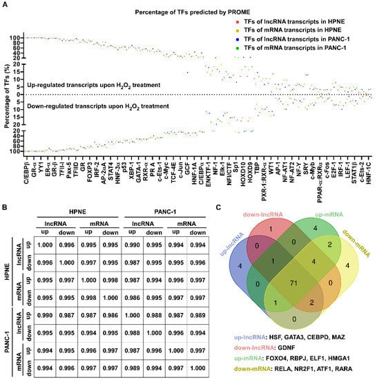 To analyze the transcription factors for the mRNA and lncRNA transcripts induced by H2O2, potential promoter regions approximately 2000 bp in front of transcriptional initiation sites of the significantly changed transcripts were downloaded from the UCSC database, and PROMO (version 8.3 of TRANSFAC) was used to predict transcription factors. The results indicated that the promoters of up- or downregulated transcripts could be recognized by the same transcription factors (Figure 5A and Table S1). Moreover, the percentage of transcription factors for the upregulated RNA transcript promoters was similar to that for the downregulated transcripts (Figure 5A). Correlative analysis indicated that, regardless of whether the lncRNAs or mRNAs were upregulated or downregulated in HPNE or PANC-1 cells, the H2O2-induced changes of transcripts consistently had DNA elements in their promoters recognized by the same transcription factors (Figure 5B). Among the 94 transcription factors identified in both cell lines, we found that 71 of them (75%) were common in up- or downregulated lncRNA and mRNA transcripts, although a few of the transcription factors occurred only in up- or downregulated lncRNA and mRNA transcripts (Figure 5C).