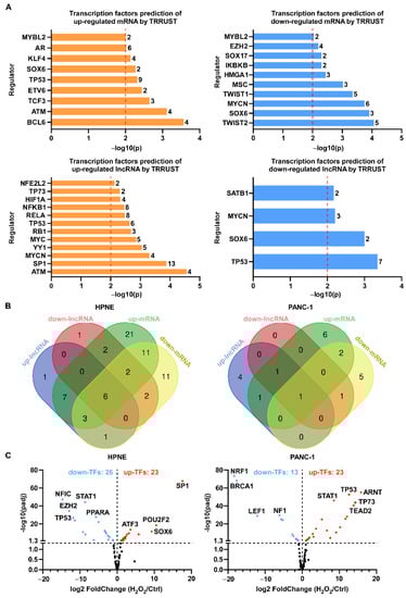 Transcription factors revealed by TRRUST analysis in HPNE and PANC-1 cells treated with H2O2. (A) Top transcription factors (−log10(p) > 2) of up- and downregulated lncRNA (top) and mRNA (bottom) transcripts upon H2O2 treatment in both cell lines were analyzed by TRRUST, and the counts of transcription factors are presented after the column. (B) Venn diagram showing all transcription factors predicted by TRRUST in HPNE (left) and PANC-1 (right) cell lines; the transcription factors are listed in Table 2 for HPNE cells and Table 3 for PANC-1 cells. (C) Volcano plots showing the mRNA levels of transcription factors predicted by PROMO and TRRUST upon H2O2 treatment in HPNE cells (left) and PANC-1 cells (right). Red dots represent the upregulated transcription factors (log2 (fold change) > 1 and padj < 0.05) upon H2O2 treatment, while blue dots represent the downregulated transcription factors (log2 (fold change) < −1 and padj < 0.05).