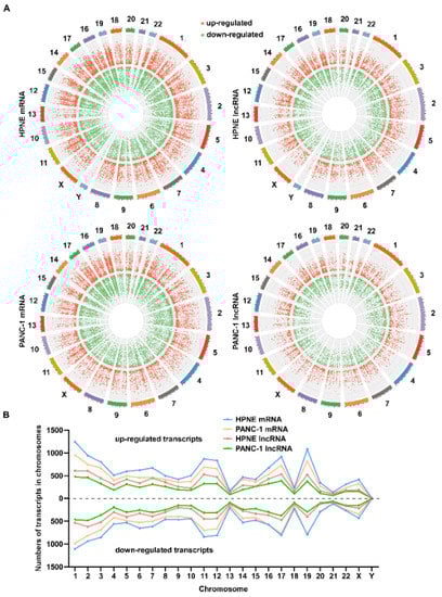 Chromosomal distribution of the differentially expressed transcripts in HPNE and PANC-1 cells treated with H2O2. (A) The chromosomal distribution of differentially expressed mRNA (left) and lncRNA (right) transcripts upon H2O2 treatment. Data are shown as Circos diagrams. The red dots represent upregulated transcripts, while the green dots represent downregulated transcripts. Relative height represents log2 (fold change). (B) Numbers of differentially expressed mRNA and lncRNA transcripts in the indicated chromosomes of HPNE and PANC-1 cells treated with H2O2. The dots below the dotted line represent the downregulated transcripts, while the top dots represent the upregulated transcripts.