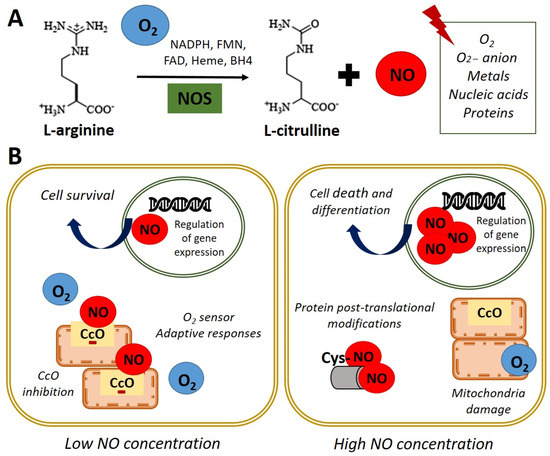 Nitric oxide (NO) is a highly reactive gas with a brief life span, synthesized by the enzyme nitric oxide synthase (NOS) through L-arginine oxidation to L-citrulline. In most mammals, the existence of 3 isoforms of the NOS enzyme has been described: NOS1 (nNOS-neuronal), NOS2 (iNOS-inducible), and NOS3 (eNOS-endothelial) [1]. NO is a free radical that interacts with oxygen (O2), super-oxide anion (O2−), metals, nucleic acids, and proteins (Figure 1A). In turn, NO is rapidly oxidized and transformed into nitrate and nitrite in a reversible reaction catalyzed by reductase enzymes activated when endogenous NOS enzymes are dysfunctional [2,3].