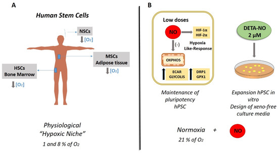 Physiological human stem cell niches versus nitric oxide-based in vitro cultures. (A) Hypoxic niches of stem cells (SCs). The figure shows the O2 tensions characteristic of the biological niches of MSCs, NSCs, and HSCs. Various studies have determined by direct measurement or applying various mathematical models the O2 tension in bone marrow, adipose tissue, and the ventricular zone of the brain where the respective SCs reside. The results showed levels between 1 and 8% of O2, revealing an O2 tension lower than the atmospheric one (21% of O2). Direct measurements in the brain have not been carried out, but tensions of 0.55% O2 have been recorded in other attached regions in rodents, and conceptual translation to humans has been carried out. MSCs (mesenchymal SCs); NSCs (neural SCs); HSCs (hematopoietic SCs) [76]. (B) Low DETA-NO in normoxia (21% O2) encourages a response similar to hypoxia in PSCs. Therefore, exposure to 2 µM DETA-NO led to the accumulation of HIF-1α and HF-2α proteins, increased expression of pluripotency genes NANOG and OCT-4, and a shift towards the expression of genes favoring glycolitic metabolism. Mitochondrial functions and dynamics were also affected, with a decrease in OXPHOS, an increase in ECAR and DRP1 expression. These actions are not dependent on changes in mROS levels while GPX1 mRNA expression increase, which is compatible with the maintenance of pluripotency as it is described in the review. All in all, these outcomes indicate that NO induces a hypoxia-like response, regulating mitochondrial functionality and metabolic parameters in human PSCs, thus maintaining pluripotency [14]. In this context, the use of NO is proposed to supplement culture media for human PSCs (hPSCs) expansion. NO (nitric oxide); OCR (O2 consumption rate); ECAR (extracellular acidification rate), OXPHOS (oxidative phosphorylation).