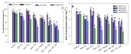 Furthermore, the results revealed that the maximum GRI were at 5% and 10% of PEG (Figure 1A,B). However, at the 15% PEG level, the lowest GRI were found. The PI31 variety had the highest GRI among all varieties, followed by PI90 and PI37 varieties (PI5A having the lowest of all genotypes). As the PEG content increased, the GRI of all genotypes decreased (Figure 1A,B).