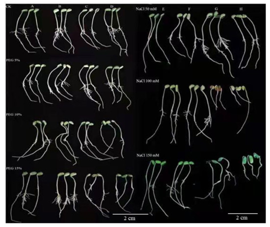 Seed germination of four soybean cultivars grown under different drought and salinity stress conditions. (A) PI31, (B) PI90, (C) PI37, (D) PI5A, (E) PI31, (F) PI90, (G) PI5A, (H) PI37.