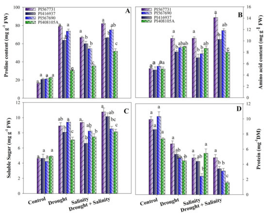 (A) Proline, (B) free amino acids, (C) soluble sugars, and (D) protein of four soybean cultivars grown under drought and salinity stress conditions. Data presented are means ± SD, and different letters denote a significant difference at p < 0.05 based on the least significant difference (LSD) test. Letter a is highly significant than b, and ab means no significant differences between a with ab and b with ab.