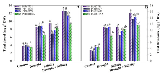 In this study, the accumulation of phenol and flavonoids was significantly augmented with drought, salinity, and combined stress treatments (Figure 6A,B, Tables S8–S11). Compared to the control, drought treated plants showed substantial improvements in their contents of phenolic compounds and flavonoids: 111% and 231.40% in PI31; 145% and 147% in PI90; 85% and 86% in PI5A; and 135% and 215% in PI37, respectively. Similar to drought treatment, the contents of total phenolic compounds and flavonoids were also increased under high salinity by 134% and 241%; 117% and 119%; 133% and 135%; and 86% and 152% in PI31, PI90, PI5A, and PI37 compared to the controls, respectively. Likewise, combined stress treatment further increased the phenol and flavonoid contents compared to the control (Figure 6A,B, Tables S8–S11).