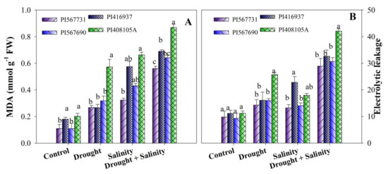 (A) Lipid peroxidation and (B) electrolyte leakage of four soybean cultivars grown under drought and salinity stress conditions. Data presented are means ± SD, and different letters denote a significant difference at p < 0.05 based on the least significant difference (LSD) test. Letter a is highly significant than b, and ab means no significant differences between a with ab and b with ab.