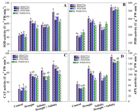 (A) Superoxide dismutase, (B) peroxidase, (C) catalase, and (D) ascorbate peroxidase activity levels of four soybean cultivars grown under drought and salinity stress conditions. Data presented are means ± SD, and different letters denote a significant difference at p < 0.05 based on the least significant difference (LSD) test. Letter a is highly significant than b, and ab means no significant differences between a with ab and b with ab.