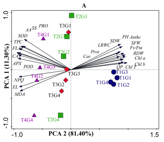 Multivariate statistical analysis indicates associations between treatments, variables, and cultivars. (A) Principal component analysis (PCA) based on eco-physiological traits in four soybean cultivars affected by drought, salinity, and combined stress. Blue circles, PI567731; green symbols, PI416937; red symbols, PI567690; and purple symbols, PI408105A in control, drought, salinity, and drought + salinity treatments; (B) Heatmap of correlation. T1, control: T2, drought: T3 salinity: T4 drought + salinity; G1, PI567731: G2, PI416937: G3, PI567690: G4, PI408105A. Chl: chlorophyll; Car: carotenoids Chl T: total chlorophyll; PH; plant height; SFW: shoot fresh weight: SDW: shoot dry weight: QP: photochemical quenching; NPQ: non-photochemical quenching; maximal photochemical efficiency (Fv/Fm), RLWC: relative leaf water content; MDA: malondialdehyde; EL: electrolyte leakage; PRO: proline; SS: soluble sugar; CAT: catalase; POD: peroxidase; SOD: superoxide dismutase; APX: ascorbate peroxidase; FLAV: flavonoid content; TPC: total phenolic content; AA: amino acid.