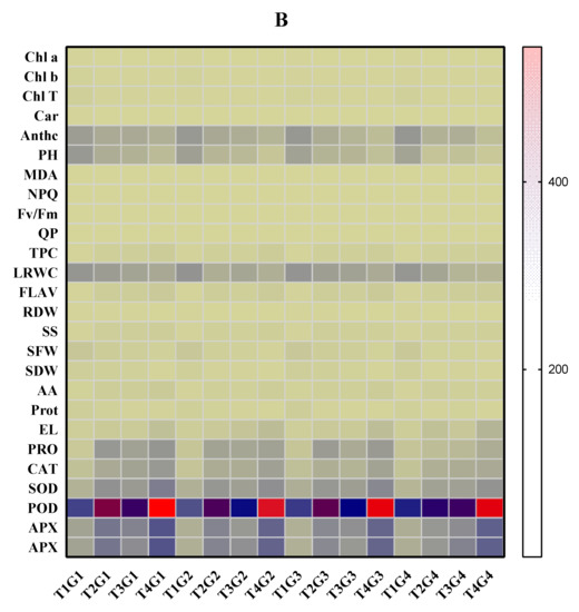 Furthermore, the heat map elucidates the physiological responses of the four soybean cultivars under various stress conditions, including drought, salinity, and combined stress (Figure 9B). According to our data, under drought, salinity and combined treatments, plant weights (SFW and SDW), Chl content, qp, RWC, protein, Fv/Fm activity, and proline content were correlated positively with secondary metabolites (phenol and flavonoids) and antioxidative enzymes (CAT, POD, APX, and SOD). The stress treatments are grouped apart from the other soybean treatments because of their increased NPQ, MDA, and EL contents.