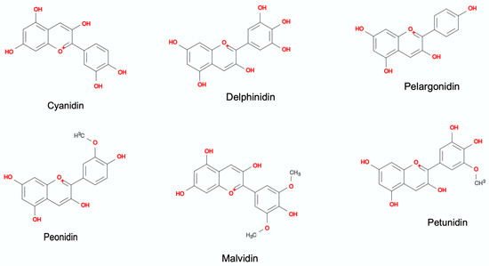 Molecular structure of anthocyanidins (Cyanidin, Delphinidin, Pelargonidin, Peonidin, Malvidin, and Petunidin). The figure was created with Mind the Graph (https://mindthegraph.com (accessed on 10 February 2022)).