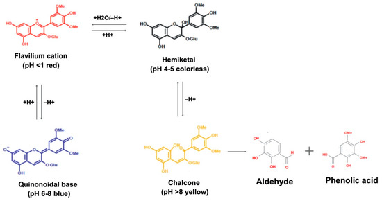 However, the color and molecular stability of these pigments are influenced by various factors, such as molecular structure, pH changes, exposure to light, proteins and metallic ions, enzymatic action, and intestinal microbiota [92]. The chemical structure of these compounds, mainly the number and position of the hydroxyl group (-OH) and methoxy groups (-OCH3), influences the molecular stability [25,84]. Furthermore, the pH has a significant influence on the structure and color of the anthocyanins. The variations in pH result in different molecular balances, in which at low pH (acidic) the anthocyanins are particularly red and predominantly in the form of flavylium cation; at slightly acidic pH the structure is colorless hemiketal; and hemiketal chalcone is converted in chalcone by a ring-opening with a yellowish coloration, which at basic pH predominates the quinoidal structure and purple/blue coloration (Figure 2) [93]. The presence of glycosides increases water solubility; on the other hand, acetylation provides higher stability to the anthocyanin molecule [94]. Other factors such as high temperature, processing, storage, and the presence of oxygen also affect stability [95].