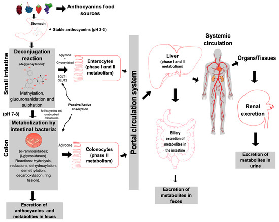 Anthocyanins can cross the stomach (pH 1.5 to 2) in their intact form. In vitro digestion simulation studies have found that anthocyanins are generally stable during incubation with gastric fluids [125,126,127,128,129,130,131,132]. In addition, some studies suggest that there is also absorption in the stomach mucosa, due to the rapid detection of anthocyanin absorption markers in the bloodstream after ingestion of food rich in this compound [104,121,122]. However, most of the absorption occurs in the intestine. In the small intestine (pH 7.4–8), mainly in the jejunum, the absorption of glycosylated forms occurs. Anthocyanidins are passively absorbed after the action of hydrolytic enzymes (changing anthocyanins to the aglycone form) and/or the absorption of glycosylated forms occurs through glucose transporters (SGLT1 and GLUT2) [123,124]. Moreover, the integrity of the intestinal villi is critical for absorption [133]. In enterocytes, anthocyanins undergo phase 2 reactions of metabolism, such as methylation, glucuronidation, and sulfation, catalyzed by UDP-glucuronosyltransferase, sulfotransferases, and catechol-O-methyltransferases, respectively [10,125]. Figure 3 illustrates the process of anthocyanin metabolism in the human body from the stomach to the excretion of metabolites.