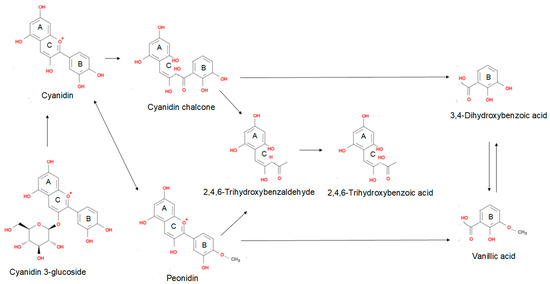 The major human metabolites identified in the bloodstream were gallic, vanillic, protocatechuic, 3,4-dihydroxybenzoic, syringic, p-cumaric, vanillic, 2,4-dihydroxybenzoic, 2,4,6-trihydroxy benzoic, and 2,4,6-trihydroxy benzoic acids [4,128]. The aglycone form can also be metabolized by intestinal bacteria as a carbon source, decomposing into organic acids such as 3,4-dihydroxyphenylacetic, m-hydroxyphenyl acetic, and m-homovanilic acids [131]. However, after ingestion of the anthocyanin source, a limited quantity of intact anthocyanins was detected in the systemic circulation [84,130].
