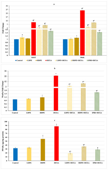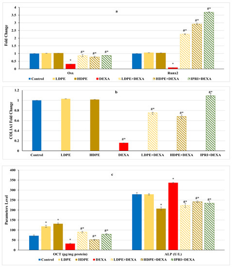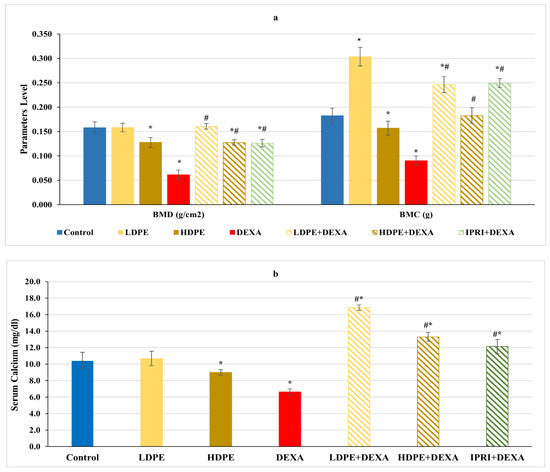On the other hand, DEXA injection significantly (p < 0.05) increased serum ALP activity compared with the control group (Figure 4c). However, all the treated rats (LDPE + DEXA, HDPE + DEXA, and IPRI + DEXA) exhibited a significant (p < 0.05) decrease in this activity compared with both DEXA-rats and control rats.