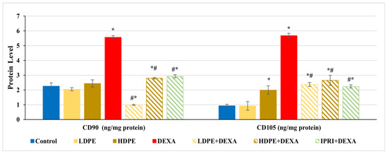 The protein levels of cluster differentiation-90 and -105 (CD90 and CD105) proliferation markers of the different experimental groups. Values are mean ± SD (n = 8). *: significant (p < 0.05) compared to control. #: significant (p < 0.05) compared to DEXA. LDPE, low-dose of date pit extract (150 mg/kg); HDPE, high-dose of date pit extract (300 mg/kg); DEXA, dexamethasone (1 mg/kg); LPDE + DEXA, low-dose of date pit extract + dexamethasone; HPDE + DEXA, high-dose of date pit extract + dexamethasone and IPRI + DEXA, ipriflavone (50 mg/kg) + dexamethasone.