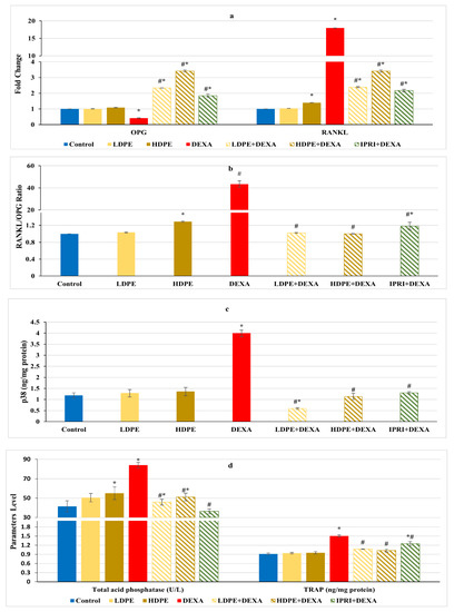 In contrast with the control rats, the DEXA injected group triggered the release of bone turnover markers as indicated by a significant (p < 0.05) elevation in serum acid phosphatase (ACP) activity, bone tartrate resistance acid phosphatase (TRAP), and bone p38 protein content, compared with the control group (Figure 5c,d). Interestingly, LDPE + DEXA, HDPE + DEXA, and IPRI + DEXA rats experienced significant (p < 0.05) decreases in these parameters compared with DEXA rats. Moreover, the LDPE + DEXA group showed a significant (p < 0.05) decline in p38 protein content and non-significant (p < 0.05) changes in serum ACP activity compared with the control values (Figure 5c,d).