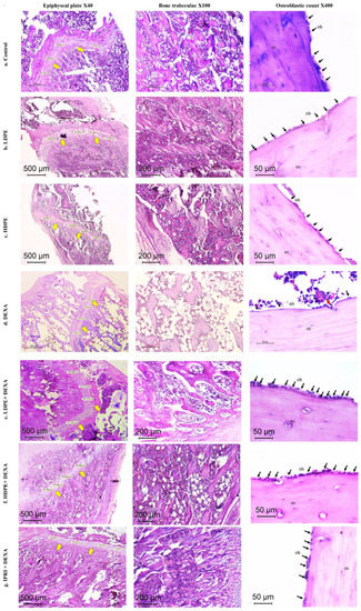The control group presented typical histology with well-ordered bone trabeculae arrangements, with an epiphyseal plate thickness of 277 µm and an osteoblastic mean count of 18/high power field (HPF). Thick and continuous bone trabeculae were observed (score 0), where trabecular bone areas (TBA) were scored 0. Both groups which received DP in low and high doses (LDPE and HDPE) showed similar findings with no pathologic changes detected (Table 5 and Figure 6).