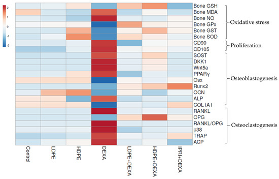 Heat map distribution of bone reduced glutathione (GSH), malondialdehyde (MDA), nitric oxide (NO), glutathione peroxidase (GPx), glutathione-S-transferase (GST), superoxide dismutase (SOD), differentiation-90 and -105 (CD90 and CD105), sclerostin (SOST), Dickkopf Wnt signaling pathway inhibitor 1 (DKK1), Wnt family member 5a (Wnt5a), peroxisome proliferator-activated receptors (PPARγ), osterix (Osx), Runt-related transcription factor 2 (Runx2), osteocalcin (OCN), collagen type 1 alpha 1 (COL1A1), receptor activator for nuclear factor-kappa B ligand (RANKL), osteoprotegerin (OPG), RANKL/OPG ratio, p38, tartrate resistance acid phosphatase (TRAP), serum acid phosphatase (ACP) and alkaline phosphatase (ALP). The color is distributed from blue (low level/expression or activity) to red (high level/expression or activity).