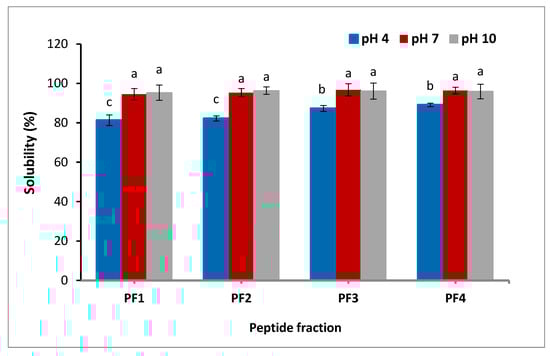 Solubility of the isolated peptide fractions at pH 4.0, 7.0, and 10.0. Results are illustrated as means ± SD and values within each column with the different letters are significantly different (p < 0.05).