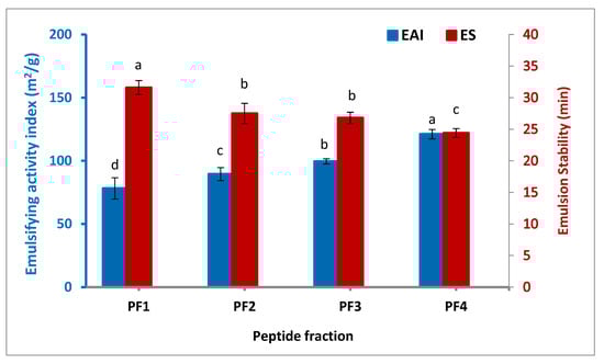 Figure 2 illustrates the emulsifying activity index (EAI) and emulsion stability (ES) of the isolated peptide fractions. The highest EAI was observed for PF4 (121.1 m2/g), followed by PF3 (99.6 m2/g), PF2 (89.5 m2/g), and PF1 (78.2 m2/g), denoting a significant increase in EAI when the molecular weight of the peptide fraction was lower (p < 0.05). The same trend was also found by Zamorano-Apodaca et al. [], who reported that when the molecular weight of the peptide fractions decreased, the EAI and superficial hydrophobicity increased by the higher generation of small fat globules, allowing molecular rearrangement and unfolding to occur at the emulsion interface, and hence, the subsequent diffusion at the interface between oil and water. In contrast to what was found in the case of EAI, the ES of the peptide fractions decreased at lower molecular weight, which varied from 24.4 to 31.6 min. In terms of minimizing interfacial tension, smaller peptides are less effective, but this is not enough to improve their emulsion stability because of the lack of viscosity and reorientation at the interface. As a result, they quickly disrupt the emulsion process. Similar studies have observed that emulsion stability is improved with increasing the molecular weight of peptides [,].
