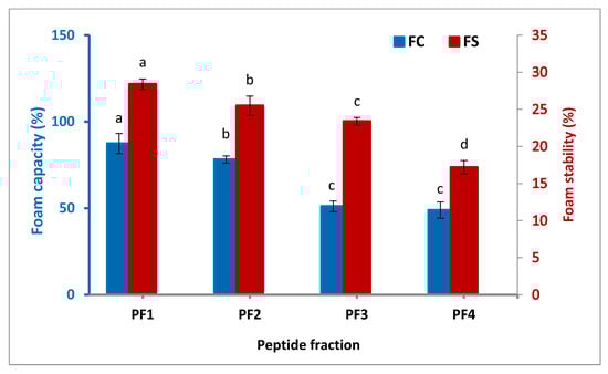 Foam capacity and stability of the isolated peptide fractions. Results are illustrated as means ± SD and values within each variable with the different letters are significantly different (p < 0.05).