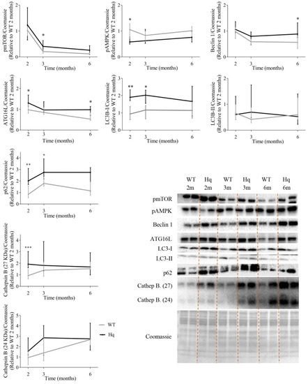 To analyze if MD was associated with autophagy alterations depending on age, the levels of proteins representative of distinct phases of the autophagy pathway were measured at 2, 3 and 6 months of age, respectively, in WT and Hq mice of the time-course study (Figure 1). The analysis of the main regulators of autophagy showed the following results. First, the levels of the active form (phosphorylated at residue Ser2448) of the mechanistic target of rapamycin (pmTOR) tended to be higher in Hq mice than in WT mice at all ages, with the difference between both groups significant at 3 months of age (Figure 1). In turn, the levels of 5′ AMP-activated protein kinase (AMPK) phosphorylated at residue Thr172 (pAMPK), which is associated with a state of autophagy activation in response to low cellular energy availability, tended to be lower in Hq mice than in WT, with the between-group difference significant at 2 months of age. Subsequently, the levels of two proteins involved in the early stages of formation of the phagophore (i.e., the double membrane that encloses and isolates the cytoplasmic components during autophagy), Beclin 1 and autophagy-related protein 16-like (ATG16L), were quantified. We found the trend towards higher levels of both proteins in Hq mice compared to WT mice, with the difference between groups significant at 2 (for both Beclin 1 and ATG16L) and 6 months of age (for ATG16L only). The determination of microtubule-associated protein 1B light chain I (LC3B)-I and LC3B-II (which is formed after LC3B-I conjugation to phosphatidylethanolamine) showed that LC3B-I levels tended to be higher in Hq mice at all ages, with the between-group difference significant at 2 and 3 months. Next, we measured the levels of the protein p62, which tended to be higher in Hq mice than in WT mice at all ages, with between-group differences significant at 2 and 3 months. Finally, to assess the lysosomal content in Hq mice, the levels of the lysosomal protease cathepsin B (protein bands at 27 and 24 KDa) were quantified, with the results showing a trend towards higher values in Hq mice and with a significant difference vs. WT mice for the 27 KDa band at 2 months of age (Figure 1).