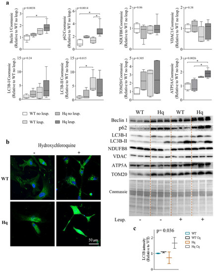 Finally, we detected LC3B by immunofluorescence in WT and Hq cardiomyocytes isolated from neonatal mice treated with hydroxychloroquine (a lysosomal inhibitor which basifies lysosomes) for 24 h (Figure 2b,c). The analysis of LC3B fluorescence intensity per cell showed significant differences between groups (p = 0.036), although post hoc tests did not reveal differences between pairs of groups. A higher LC3B fluorescence was observed in hydroxychloroquine-treated Hq cardiomyocytes compared to untreated Hq cells, with this difference greater than that observed between treated and untreated WT cardiomyocytes. These findings may suggest a more active autophagic flux in neonatal Hq cardiomyocytes compared to WT cells (Figure 2c).