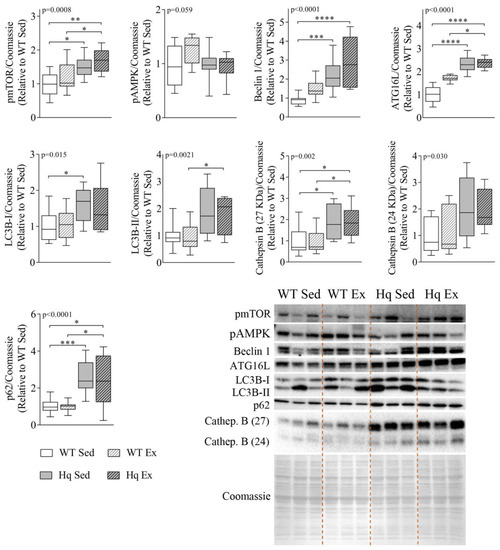 In order to determine if exercise training could induce normalization of autophagy markers in the heart tissue of Hq mice, we measured several autophagy-related proteins in sedentary and exercise-trained animals (Figure 3). We found significant differences between experimental groups for most variables (pmTOR, p = 0.0008; Beclin 1 and ATG16L p < 0.0001; LC3B-I, p = 0.015; LC3B-II, p = 0.0021; p62, p < 0.0001; and cathepsin B (p = 0.002 for 27KDa and p = 0.0305 for 24 KDa band)) (Figure 3). However, post hoc analyses revealed that the training intervention did not induce a significant effect in either Hq or WT. All the observed differences between pairs of experimental groups were due to genotype (i.e., MD) and corroborated our previous results regarding the differences in ATG16L and Beclin 1 levels between WT and sedentary Hq mice. In addition, statistical significance was also reached for post hoc differences in LC3B-I and II, pmTOR, p62 and cathepsin B (27 KDa) between sedentary Hq and WT mice. We found quasi-significant differences in pAMPK between sedentary Hq and WT mice (p = 0.059) (Figure 3).