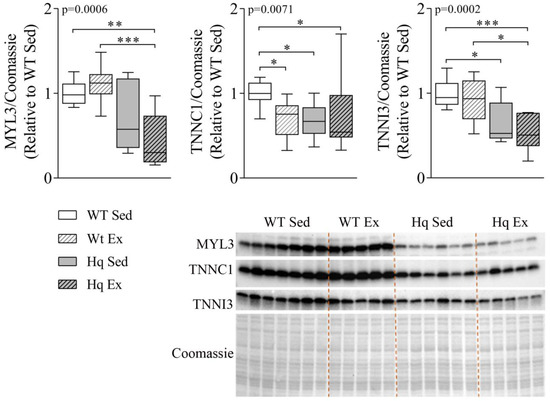 To analyze if autophagy might be involved in the degradation of the contractile machinery of the heart, we measured the levels of three sarcomere proteins in the hearts of mice in the intervention study. The results are shown in Figure 4. We found a significant group effect for the proteins myosin light chain 3 (MYL3), cardiac troponin I3 (TNNI3) and cardiac troponin C1 (TNNC1) (p-value = 0.0006, 0.0002 and 0.0071, respectively), with overall lower levels of these proteins in Hq mice (Figure 4). In post hoc pairwise comparisons, sedentary Hq mice showed lower levels of TNNI3 and TNNC1 than sedentary WT mice (Figure 4). On the other hand, the exercise training intervention did not induce any significant change (i.e., no differences between exercise-trained and sedentary Hq, respectively). However, strikingly, we found lower levels of TNNC1 in trained WT mice than in sedentary WT mice.