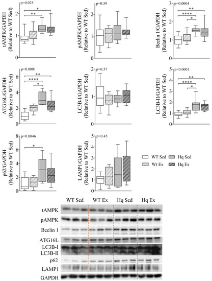 To study whether autophagy was also altered in skeletal muscle, as well as the potential effects of exercise training in this process, we measured the levels of different proteins representing distinct phases of autophagy in homogenates of the biceps femoris of the exercise training study groups (Figure 5). We found a significant group effect for total AMPK (tAMPK) levels (p = 0.025), with post hoc analysis revealing higher tAMPK in both Hq mice (exercise-trained or sedentary) than in sedentary WT mice. However, the analysis of pAMPK levels showed no difference between groups, indicating that the training intervention did not produce a significant effect on total or phosphorylated AMPK levels in any of the experimental groups. We also detected a significant group effect for Beclin 1, ATG16L, LC3B-II and p62 (p = 0.004, p < 0.001, p < 0.001 and p = 0.0046, respectively), with post hoc comparisons showing higher levels of Beclin 1, ATG16L and LC3B-II in both Hq groups than in sedentary WT animals, as well as higher levels of these proteins in sedentary Hq mice compared to sedentary WT mice. In the case of p62, the post hoc test only showed differences between sedentary groups of mice. On the other hand, we did not observe a significant group effect for LC3B-I or lysosomal-associated membrane protein 1 (LAMP1) levels between experimental groups, for either disease or training effect (Figure 5).