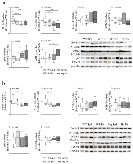 Autophagy proteins and effects of exercise training in central nervous system. Representative Western blot and densitometry analysis of autophagy-related protein 16-like (ATG16L), Beclin 1, microtubule-associated protein 1B light chain I (LC3B-I) and II (LC3B-II), p62 and lysosomal-associated membrane protein (LAMP1) in cerebellum (a) and brain (b) homogenates of wild-type (WT) and Harlequin (Hq), sedentary (Sed) and exercise-trained (Ex) mice of the intervention study (n = 10–12 male mice, age 5.3 months). γ-tubulin was used as protein loading control. Data (median, interquartile range, minimum and maximum values) are relative to the control group (WT Sed). p-values for group effect (Kruskal–Wallis test) are shown in the above graphs. Symbols for significant differences in post hoc (Dunn’s test) pairwise comparisons: * p < 0.05; ** p < 0.01; *** p < 0.001; **** p < 0.0001.