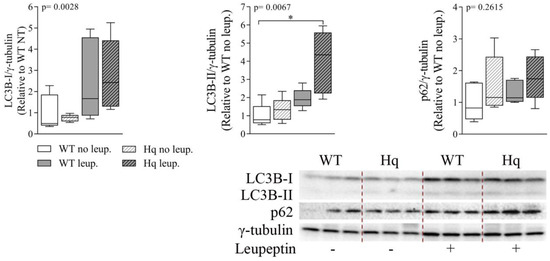 Finally, the analysis of leupeptin treatment of WT and Hq mice (Figure 7) showed significant accumulation of LC3B-I and LC3B-II in both WT and Hq leupeptin-treated cerebella (p = 0.0028 and p = 0.0067, respectively) and a significant post hoc difference between treated Hq and non-treated WT, revealing normal autophagosome elimination in this tissue in the Hq mouse (Figure 7). Protein p62 was also apparently higher in WT and Hq mouse leupeptin-treated cerebella, supporting normal autophagic flux in the Hq cerebellum. However, we found no significant group effect, probably due to the variability in the low number of animals analyzed (n = 5–6 in each experimental group), and the time selected for the treatment, which was optimal for the heart but not for the CNS [47].