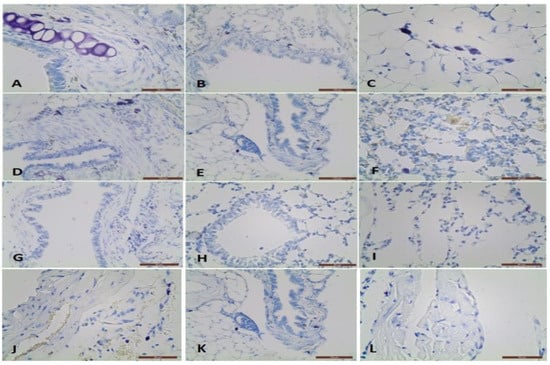 The MCs in the large bronchi’s wall was the highest in BLM group (p ˂ 0.05), followed by BLM + L. minor group and the controls (Table 1, A4, p ˂ 0.0001/B2, p ˂ 0.01). MCs were localized predominantly in the adventitial and the airways muscle layers. In BLM administrated animals 30% of MCs were found in the large bronchi propria, while in other two groups MCs were observed mainly in the muscle layer and adventitia. In the small bronchi wall, MCs number was similar in both groups BLM and BLM + L. minor, while in the control were not identified. MCs were not observed in the terminal bronchioli in four treated groups. In the blood vessel’s wall, MCs were identified mainly in the adventitial layer is presented on Figure 1J–L. The most MCs were detected in the arteries adventitia and veins as well as near the lung capillaries in the BLM group. The combined BLM + L. minor use may reduce MCs, inflammatory infiltration and alveolar destruction and may prevent histopathological changes in chronic BLM induction. It is important to note that in the interalveolar septa, MCs number was highest in the BLM group (Table 1, A3 p ˂ 0.001). However, in BLM + L. minor group and controls, single cells -were observed. The MCs number per area of lung was increased with BLM-administration and was inhibited by L. minor. These data correlated with the thickness of the interalveolar septa which was largest in the BLM group, but it decreased in the BLM + L. minor group and was lowest in the controls (Table 1) (Figure 1C,F,I). No statistical significance was detected between the BLM + L. minor group and controls.