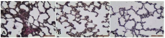 The photomicrographs of lung sections (middle pulmonary field) obtained from male BALB/c mice. Groups: (A) mice with BLM induced fibrosis and intensive red staining of collagen deposition, (B) mice with BLM induced fibrosis treated with L. minor and non-collagen deposition; (C) controls, non-collagen deposition. Tissues stained by Van Gieson, scale bar 50 μm; p < 0.001 significant difference compared (A) with (B,C).
