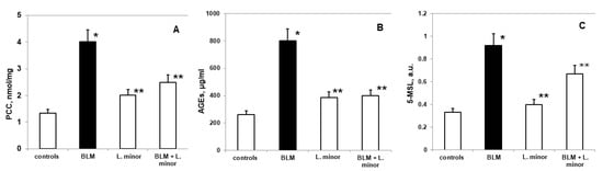 The L. minor effects on BLM-induced oxidative changes in protein carbonyl content (PCC, (A)), advanced glycation end products (AGEs, (B)) and 5-MSL protein oxidation (C). Statistically significance was higher than controls, p < 0.05, t-test. The results are presented as mean ± S.E. p < 0.05; (*) vs. to controls; (**) vs. BLM.