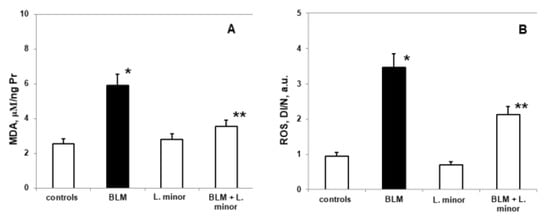 The L. minor effects on BLM-induced oxidative changes in malondialdehyde concentration (MDA, (A)) ROS production (B). Statistically significance was higher than controls, p < 0.05, t-test. The results are presented as mean ± S.E. p < 0.05; (*) vs. to controls; (**) vs. BLM.