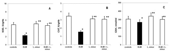 The L. minor effects on BLM-induced oxidative changes in catalase (CAT, (A)), superoxide dismutase (SOD, (B)) and glutathione (GSH, (C)). Statistically significance was higher than controls, p < 0.05, t-test. The results are presented as mean ± S.E. p < 0.05; (*) vs. to controls; (**) vs. BLM.