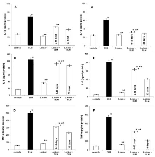 The L. minor effects on BLM-induced pulmonary fibrosis and the expressions of IL-1β, IL-6, and TNF-α in mouse lung homogenates (IL-1β, IL-6 and TNF-α, (A,C,D), respectively) and plasma (IL-1β, IL-6, and TNF-α, (B,E,F), respectively). The L. minor effect was investigated in two ways: (1) throughout the 33 day course (2) for the first 16 days. The results are presented as mean ± S.E. p < 0.05; (*) vs. to controls; (**) vs. BLM.