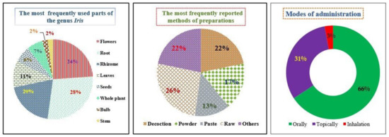 In Turkey, the rhizomes, roots and flowers of I. persica L., I. germanica L. and I. caucasica Hoffm are consumed as a snack (either alone or with bread) [31,32,33,34]. In Italy, I. germanica L. rhizomes are used for respiratory diseases, to strengthen children’s teeth, against chilblains and as a vomiting agent [35]. Further details about the ethnobotanical uses of Iris spp., mode of preparations, routes of administration and used parts are collected and listed in (Table 2). The below figures are based on more than 40 ethnobotanical studies conducted worldwide.