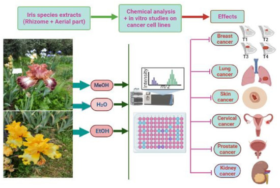 Recently, phytochemical investigations of Iris species have resulted in the identification of various bioactive compounds belonging to different classes, including alkaloids [11], flavonoids and their derivatives [12,13,14], quinones, terpenes, steroids and simple phenolics [15]. Modern pharmacological studies have reported that these compounds exhibit significant effects on human health, such as cancer chemopreventive properties [16] and anticancer [17], antioxidant [18], antiplasmodial [19], immunomodulatory and anti-inflammatory activities [20].