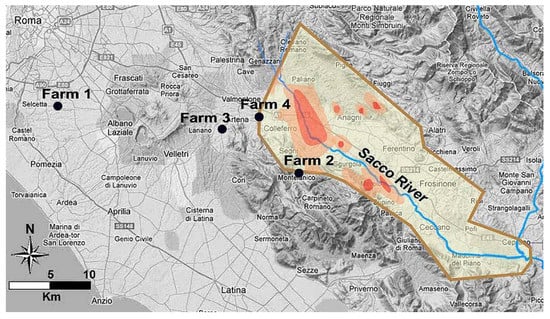 Farm 3 (“Reference farm” with an intensive livestock system) was near to Giulianello (Artena district), outside the polluted area, rearing 150 Lacaune ewes, a recently imported breed with high milk production, fed with Medicago sativa hay, barley, ryegrass, soy, cornmeal, beet, and a supplement of proteins.