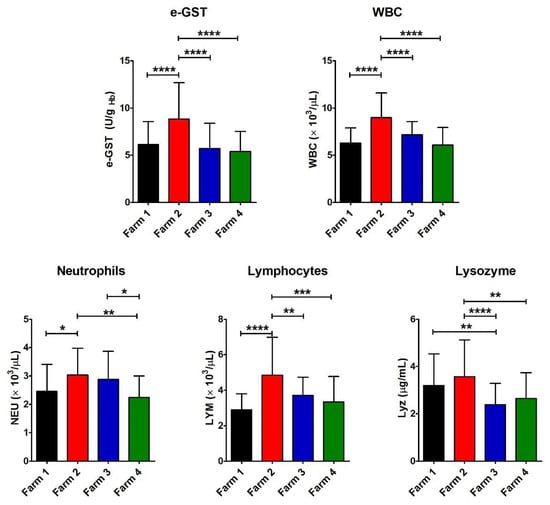 Values of e-GST, immune response, and infection biomarkers. Histograms show the average for the eight parameters measured for each farm (Farm 1–4). The error bars represent the standard deviations. At the top of the columns, the asterisks represent the p-values (see Materials and Methods) (p ≤ 0.05 (*), p ≤ 0.01 (**), and p ≤ 0.0001 (****)).