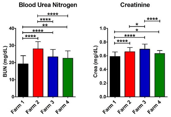 In order to evaluate any possible damage to the kidney efficiency, BUN and Crea were tested on the collected samples in all the farms (Figure 3). A significant increase in BUN was found in Farm 2 compared to Farm 1 and 3, suggesting slight kidney suffering [19,25]. However, the Crea value was within the physiological range of species in all the farms (Table 3). Furthermore, in Farm 1 (with a semi-extensive livestock system and in a not polluted district), we found a significantly lower value compared to all the other farms. The reference values are reported in Table 4.