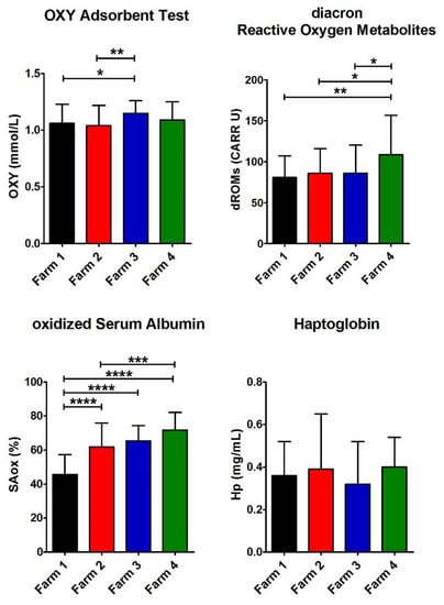 Values of biomarkers of oxidative stress. Histograms show the average for the four parameters measured for each farm (Farm 1–4). The error bars represent the standard deviations. At the top of the columns, the asterisks represent the p-values (see Materials and Methods) (p ≤ 0.05 (*), p ≤ 0.01 (**), p ≤ 0.001 (***), and p ≤ 0.0001 (****)).