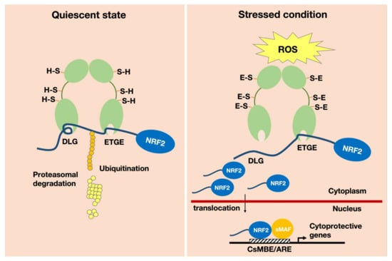 In the cytoplasm under quiescent conditions, NRF2 is polyubiquitinated by the KEAP1–CUL3 ubiquitin E3 ligase complex, which leads to rapid degradation of NRF2 through the proteasome system. In unstressed cells, NRF2 is constantly degraded. Hence, although NRF2 is synthesized in relative abundance, NRF2 is maintained at a low level within the cells [2]. However, upon exposure to oxidative or electrophilic stress, the cysteine residues in KEAP1 are modified, and KEAP1 loses ubiquitin ligase activity, allowing NRF2 to migrate into the nucleus (Figure 1). As a result, NRF2 rapidly accumulates in the nucleus. NRF2 then heterodimerizes with small MAF (sMAF) family proteins, and NRF2–sMAF heterodimers bind to cis-regulatory elements called antioxidant-responsive elements (AREs) [3] or electrophile-responsive elements (EpREs) [4]. AREs and EpREs are collectively called CNC–sMaf binding elements (CsMBEs) [5].