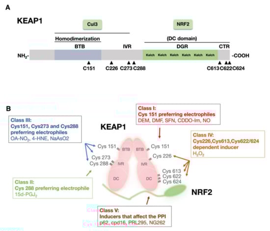 To find sensor cysteine residues that interact with ROS in addition to these three cysteines, which are crucial for sensing electrophiles, four cysteine residues, Cys226, Cys613, Cys622, and Cys624, have been recently discovered to be important for H2O2 sensing [38]. These four cysteine residues constitute the Class IV category. Notably, electrophiles and ROS are sensed by distinct sets of cysteine residues in KEAP1.