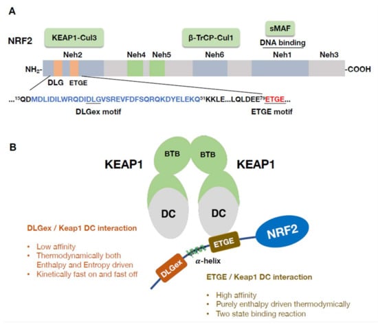 A thermodynamic study has revealed a critical difference between ETGE and DLGex motifs in their interactions with the DC domain of KEAP1 [46] (Figure 3B). Although KEAP1-DLGex binding is known to be driven by both enthalpy and entropy, KEAP1-ETGE binding is exclusively driven by enthalpy. Moreover, KEAP1-ETGE binding has been shown to be realized through a two-state binding reaction, leading to a much more stable confirmation than KEAP1-DLGex binding [46]. This difference explains the relatively high affinity of ETGE for the DC domain and forms the basis for a two-site binding/hinge-and-latch model showing the disruption of the KEAP1–NRF2 interaction with motifs behaving similar to a door hinge and latch [45,46,47].