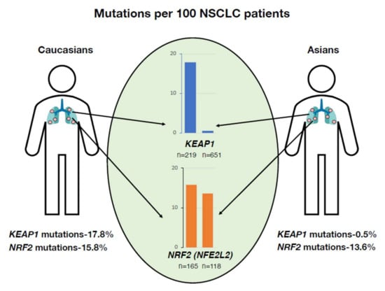 A recent comprehensive genomic study of NSCLC patients elucidated important ancestry-based disparities in the genomes of East Asian and Caucasian groups. Intriguingly, the report highlighted that NSCLCs in Japanese individual showed fewer mutations compared to those in individuals of European descent. This variation in the mutation incidence included alterations in the KEAP1 gene. Although somatic mutations in KEAP1 was found to have occurred at a rate of 17.8% in NSCLCs in the European cohort, they were found in only 0.5% of all NSCLCs in the Japanese cohort (Figure 4). This difference was not found for the NRF2 (NFE2L2) gene. Somatic mutations in the NRF2 gene were found in 15.8% and 13.6% of European and Asian patients, respectively [63].