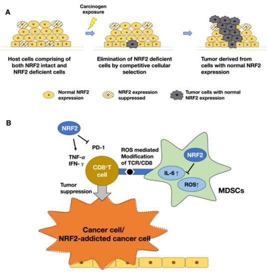 Recent progress in the pleiotropic functions of NRF2 revealed that NRF2 activation in host cells, especially in the host immune system, suppresses the aberrant growth of NRF2-activated cancer cells. In line with this finding, activation of NRF2 in the microenvironment has been shown to inhibit the progression of NRF2-activated malignant tumors [78,79,80].